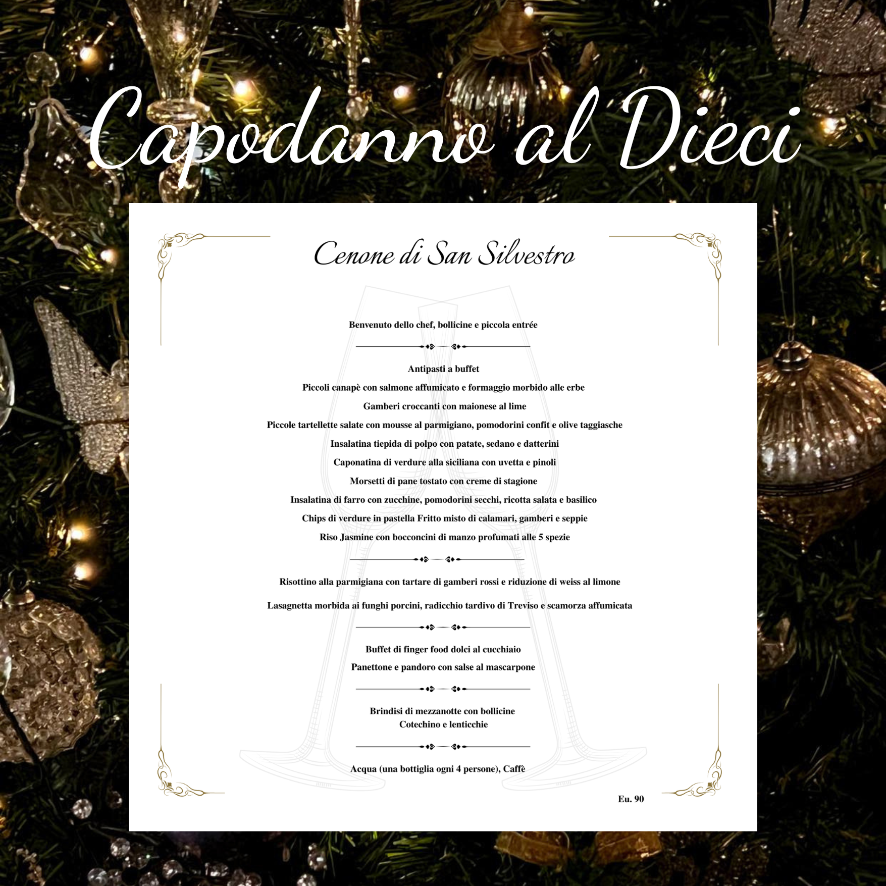 Dagli antipasti a buffet ai piatti della tradizione rivisitati, ogni portata è pensata per celebrare la notte più scintillante dell'anno nella magica atmosfera del Dieci
