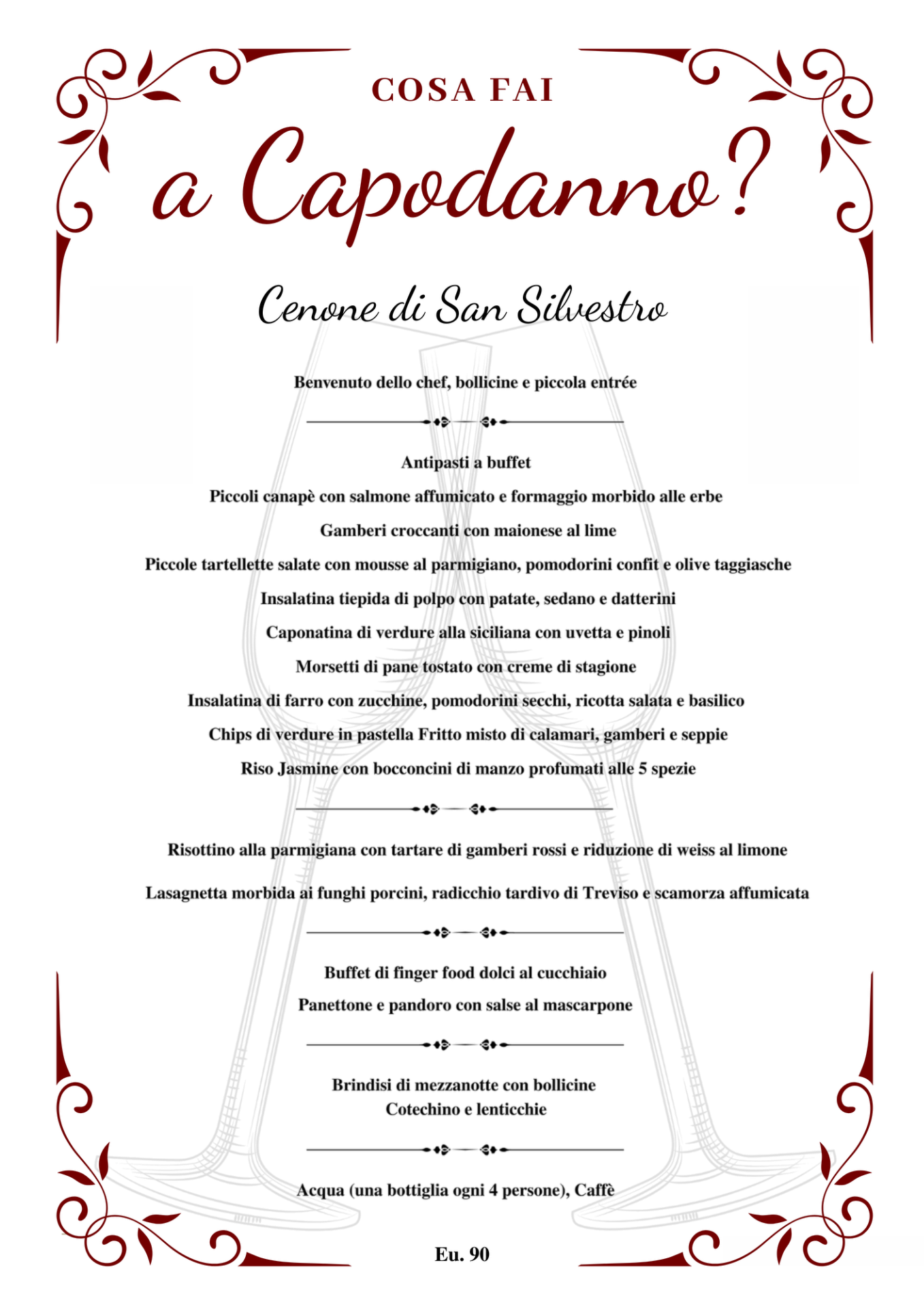 Dagli antipasti a buffet ai piatti della tradizione rivisitati, ogni portata è pensata per celebrare la notte più scintillante dell'anno nella magica atmosfera del Dieci